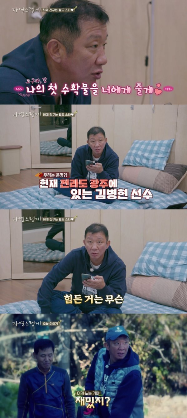 2일 오후 방송된 MBN 예능프로그램 ‘자연스럽게’에서는 늦은 밤 혼자서 ‘약초 공부’를 하던 허재가 갑자기 전 야구 스타 김병현을 떠올리고 전화를 걸었다. 허재는 김병현이 전화를 받자마자 대뜸 “내일 놀러와”라며 “내가 여기 와서 고구마랑 감도 땄어”라며 섭외에 나섰다.