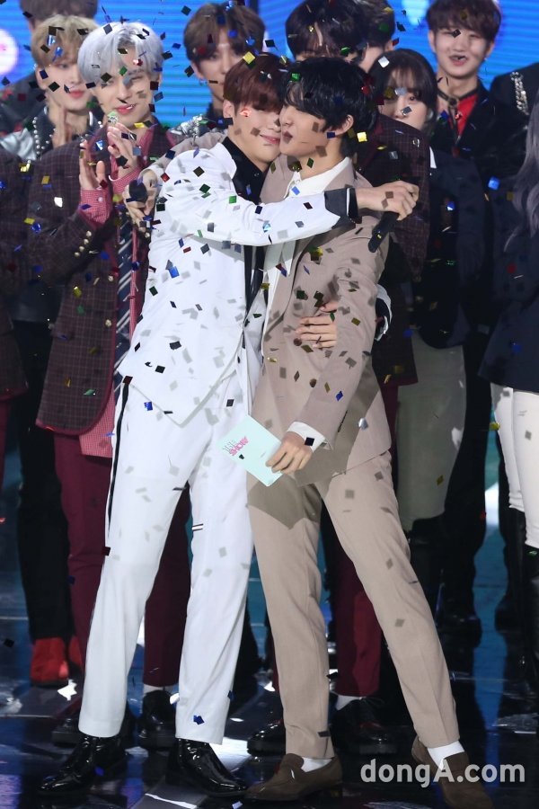 가수 강다니엘(왼쪽)이 3일 오후 서울 마포구 SBS프리즘타워에서 열린 SBS MTV \'더쇼\' 생방송 현장공개에서 1위를 차치한 뒤 배진영과 포옹을 하고 있다.