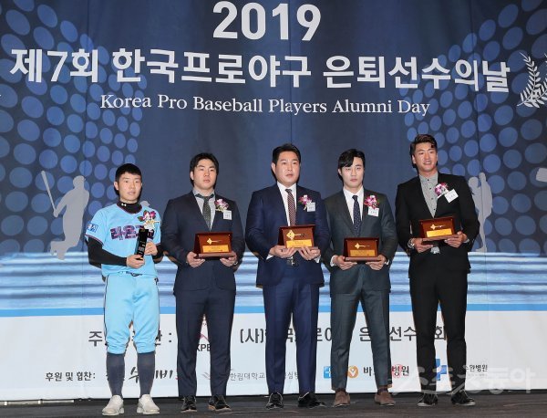라온고 김지찬, 기아 이창진, NC 양의지, 키움 김하성, SK 김광현(왼쪽부터)이 5일 서울 서초구 양재동 L타워에서 열린 ‘2019 한국프로야구 은퇴선수의 날 시상식’에서 기념 촬영을 하고 있다.