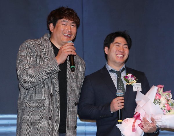 기아 타이거즈 최희섭 코치가 5일 서울 서초구 양재동 L타워에서 열린 ‘2019 한국프로야구 은퇴선수의 날 시상식’에서 신인상을 수상한 이창진과 이야기를 나누고 있다.