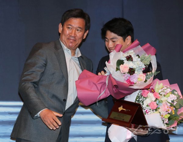 기아 타이거즈 이창진(오른쪽)이 5일 서울 서초구 양재동 L타워에서 열린 ‘2019 한국프로야구 은퇴선수의 날 시상식’에서 신인상을 수상하고 조계현 단장에게 축하 꽃다발을 받고 있다.