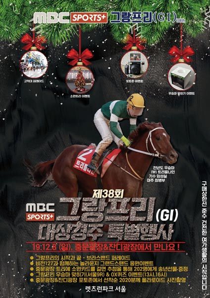 한국마사회가 제38회 그랑프리를 기념해 다양한 고객행사를 개최한다. 8일 서울 경마공원은 무료입장을 하며 오전 11시부터 오후 6시까지 중문광장과 잔디광장에서 다양한 이벤트를 연다. 마칭 밴드의 퍼레이드, 새해 소원을 크리스마스트리에 걸면 추첨을 통해 202명에게 송년선물을 증정하는 ‘소원트리 이벤트’도 실시한다. 또한 크리스마스 데코와 귀여운 말 캐릭터로 꾸며진 포토존에서는 폴라로이드 사진을 선착순 2020명에게 증정한다. OX퀴즈, 우승마 맞히기 등 경품이 걸린 퀴즈 이벤트도 준비되어 있다.