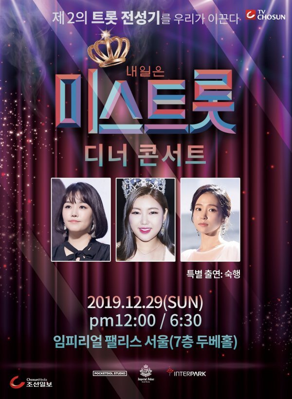 미스트롯 진, 선, 미를 차지한 송가인, 정미애, 홍자가 다가오는 연말 29일(일) 임피리얼 팰리스 서울 호텔에서 낮12시, 저녁 6시30분 총 2회 디너 콘서트를 개최한다.