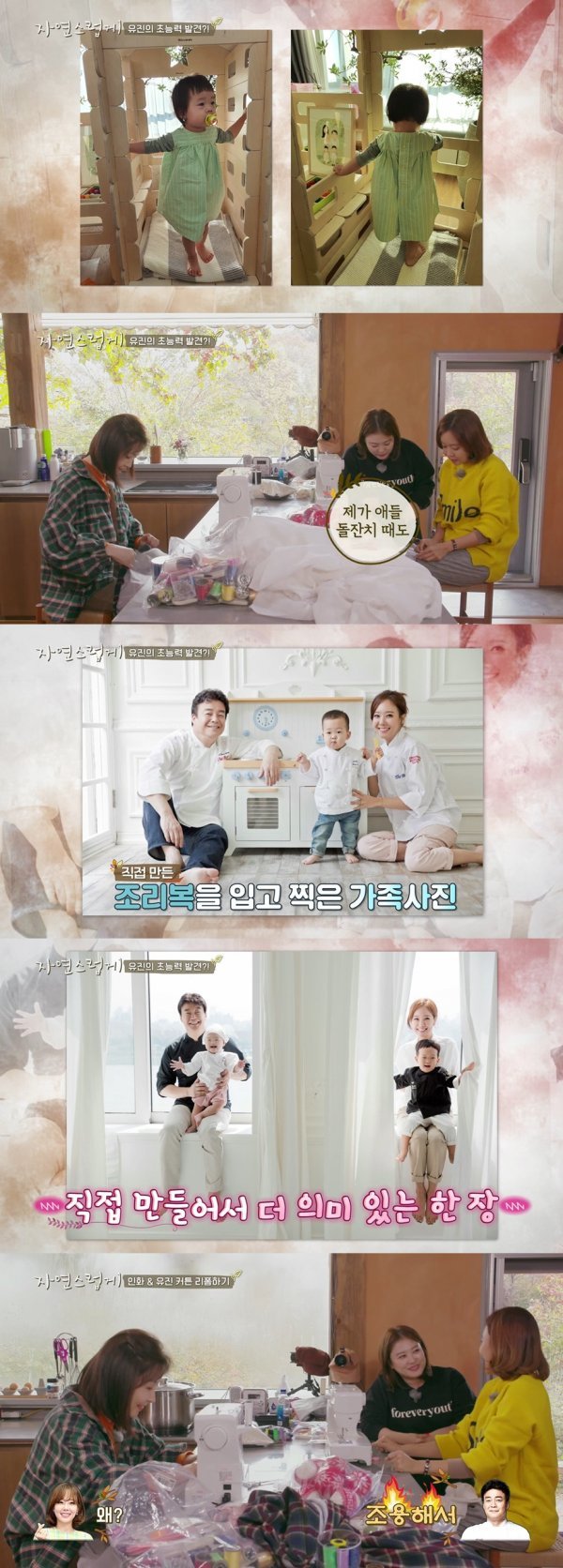 또 소유진은 “애들 돌잔치 때도 아기용 조리복을 만들어서 아빠랑 커플샷을 찍었다”고 말했고, 온 가족이 조리복을 입은 가족사진을 공개했다. 심진화는 “예쁘기도 하고 의미도 있다”며 감탄했다.