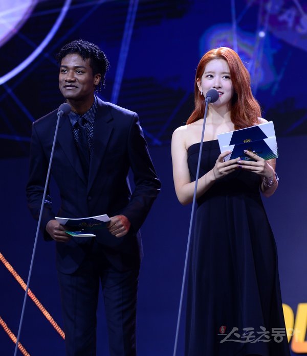 모델 한현민가 우주소녀 엑시가 1루수 부문 수상자를 발표하고 있다.