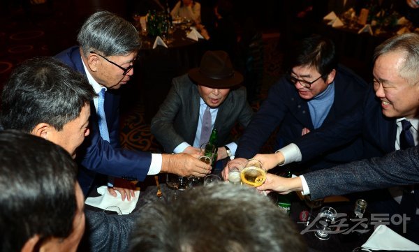 김응용 감독이 김인식 감독, 류중일 감독, 양승호 감독 및 후배들과 건배를 하고 있다.