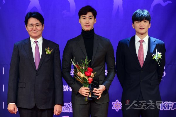 스포츠동아가 동아일보, 채널A, CMS(센트럴메디컬서비스㈜)와 공동으로 주최하고 국내 5대 프로스포츠(프로야구·프로축구·남녀프로농구·남녀프로배구·남녀프로골프) 종목별로 올 한해를 빛낸 최고의 선수를 선정하는‘CMS와 함께하는 2019 동아스포츠대상’시상식이 11일 서울 광화문 포시즌스호텔서울에서 개최됐다. 남자프로배구 올해의 선수상을 수상한 박철우가 조원태 KOVO 총재, 정지석과 함께 기념촬영을 하고 있다.