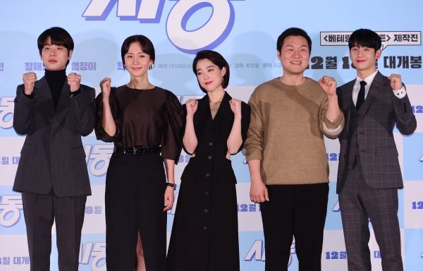 배우 박정민, 염정아, 최성은, 윤경호, 정해인(왼쪽부터)이 10일 서울 광진구 자양동 롯데시네마 건대입구점에서 열린 영화 ‘시동‘ 언론시사회에서 포즈를 취하고 있다. 주현희 기자 teth1147@donga.com