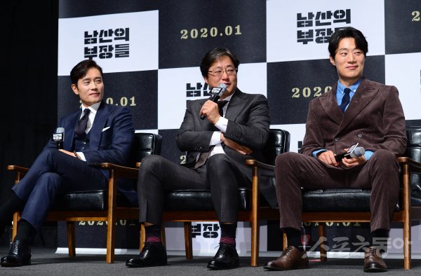 배우 이병헌, 곽도원, 이희준(왼쪽부터)이 12일 서울 강남구 신사동 CGV 압구정점에서 열린 영화 ‘남산의 부장들’ 제작보고회에서 자료화면을 보며 미소짓고 있다.