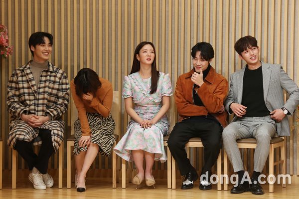 12일 오후 서울 양천구 목동 SBS방송센터에서 열린 SBS모비딕 숏폼 드라마 \'농부사관학교2\' 제작발표회에서 출연진이 포토타임을 하고 있다.