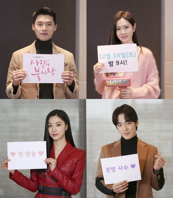 현빈, 손예진, 서지혜(서단 역), 김정현(구승준 역) 연기합이 주목되는 가운데 ‘사랑의 불시착’ 제작진은 주연 배우 4인방의 첫 방송 시청 독려 인증 사진을 공개했다. 공개된 사진에는 현빈과 손예진, 서지혜와 김정현이 본방 사수 메시지를 들고 첫 방송 시청을 독려한다.