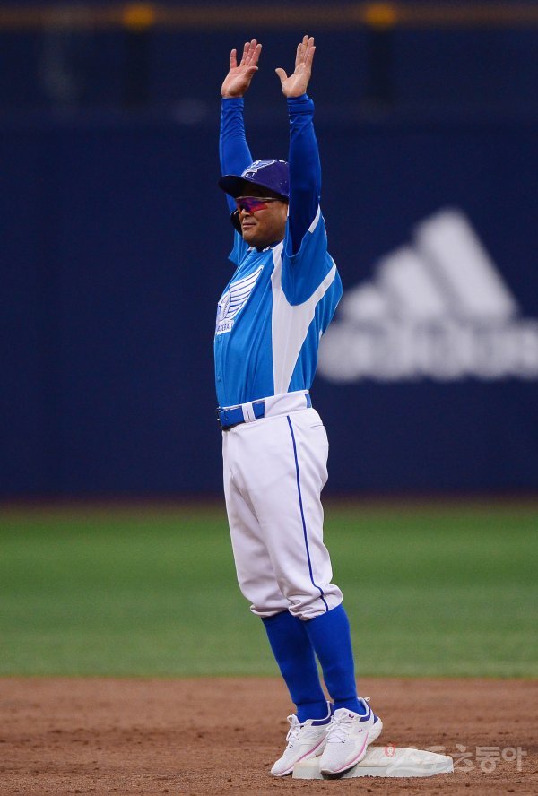 3회초 이봉주가 2루타를 치고 기뻐하고 있다.
