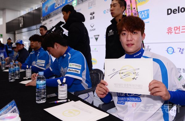 삼성 원태인이 팬사인회에서 기념 촬영을 하고 있다.