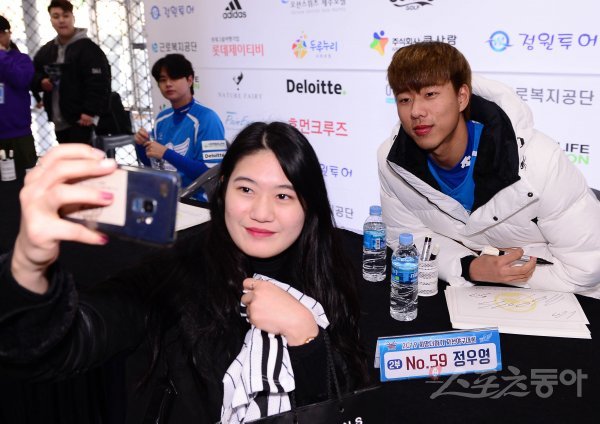 LG 정우영이 팬사인회에서 팬과 기념 촬영을 하고 있다.