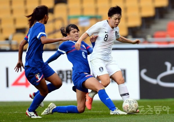 15일 부산 연제구 아시아드주경기장에서 열린 ‘2019 EAFF(동아시아축구연맹) E-1 챔피언십(동아시안컵)’ 한국과 대만의 여자부 축구 경기에서 한국 이소담이 대만 수비수를 제치며 돌파하고 있다.