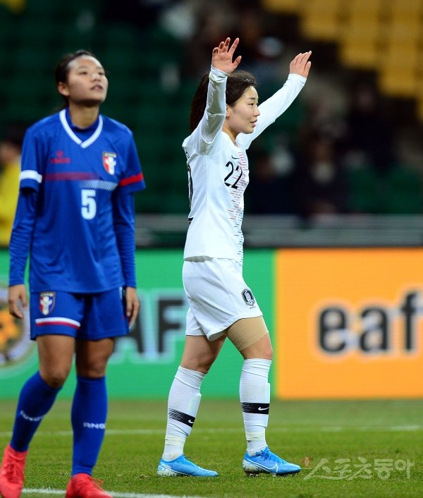 15일 부산 연제구 아시아드주경기장에서 열린 ‘2019 EAFF(동아시아축구연맹) E-1 챔피언십(동아시안컵)’ 한국과 대만의 여자부 축구 경기에서 한국 강채림이 골을 성공한 뒤 환호하고 있다.
