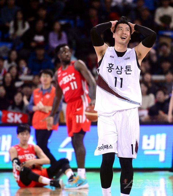 15일 잠실학생체육관에서 열린 ‘2019-2020 현대모비스 프로농구’ 서울 SK와 안양 KGC인삼공사 경기에서 KGC인삼공사 양희종이 수비 중 파울 판정을 받자 억울해하고 있다.