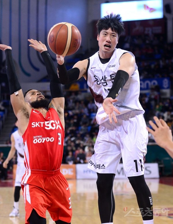 15일 잠실학생체육관에서 열린 ‘2019-2020 현대모비스 프로농구’ 서울 SK와 안양 KGC인삼공사 경기에서 KGC인삼공사 양희종이 SK 전태풍의 수비를 뚫고 골밑 패스를 하고 있다.