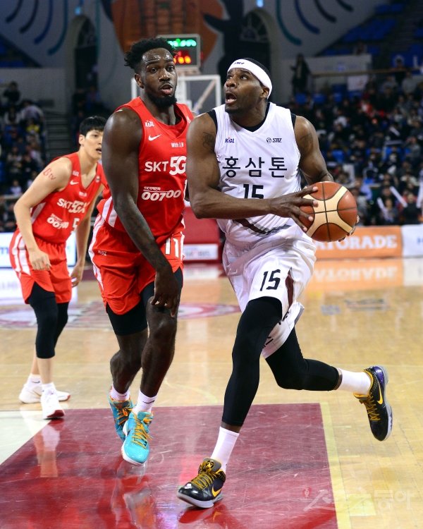 15일 잠실학생체육관에서 열린 ‘2019-2020 현대모비스 프로농구’ 서울 SK와 안양 KGC인삼공사 경기에서 KGC인삼공사 브랜든 브라운이 SK 자밀 워니의 수비를 뚫고 골밑을 공격하고 있다.