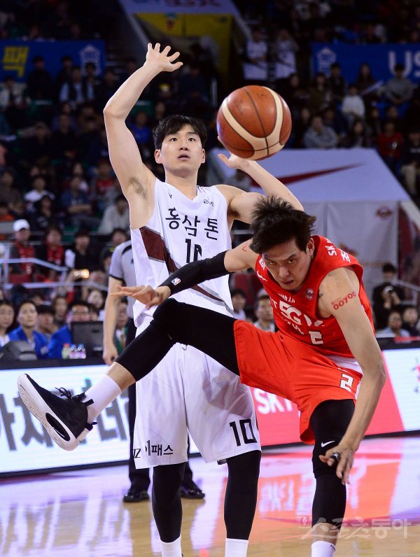 15일 잠실학생체육관에서 열린 ‘2019-2020 현대모비스 프로농구’ 서울 SK와 안양 KGC인삼공사 경기에서 SK 최준용이 KGC인삼공사 문성곤의 파울을 당하고 있다.
