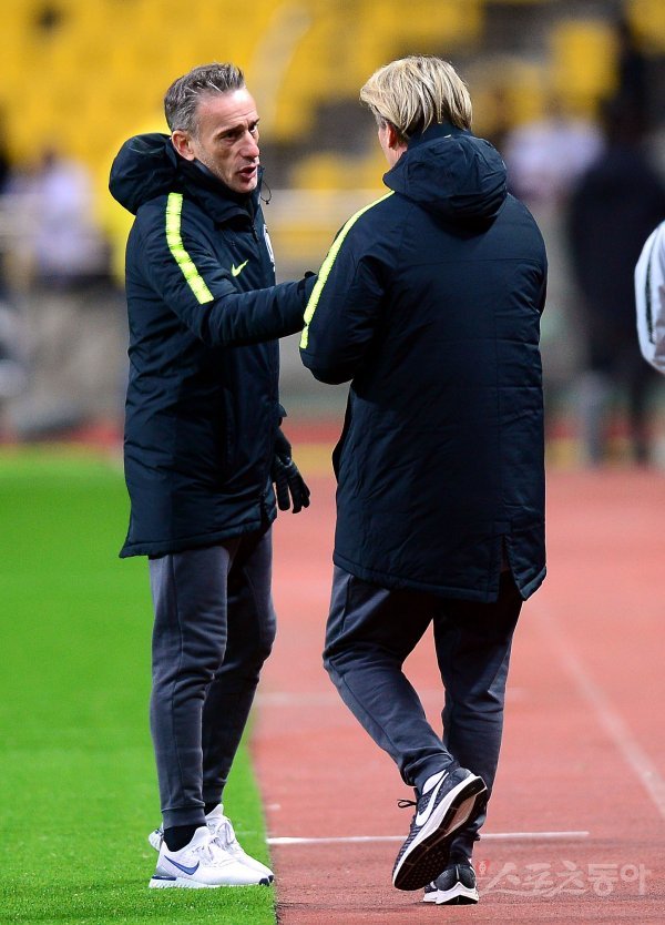 15일 부산 연제구 아시아드주경기장에서 열린 ‘2019 EAFF(동아시아축구연맹) E-1 챔피언십(동아시안컵)’ 한국과 대만의 여자부 축구 경기에서 한국이 대만에 3-0으로 승리한 뒤 벨 감독이 남자축구대표팀 벤투 감독의 축하를 받고 있다.