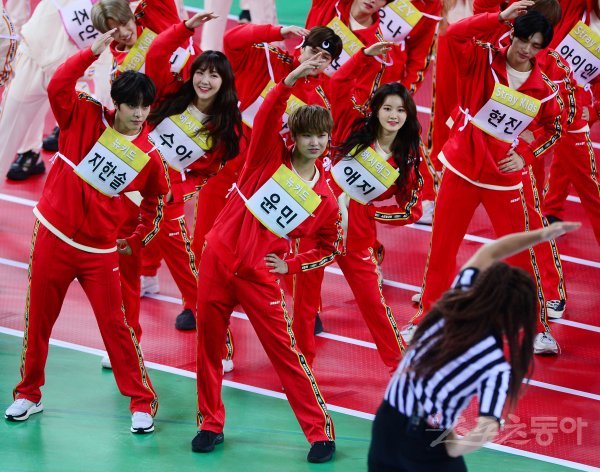 보이그룹 뉴키드와 걸그룹 해시태그가 16일 인천 남동구 남동체육관에서 MBC ‘2020 설특집 아이돌스타 선수권대회’ 오프닝 행사에서 UV 유세윤을 따라 몸풀기 운동을 하고 있다.