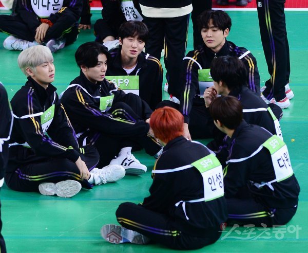 보이그룹 SF9이 16일 인천 남동구 남동체육관에서 MBC ‘2020 설특집 아이돌스타 선수권대회’ 오프닝 행사 시작 전 바닥에 앉아 쉬고 있다.