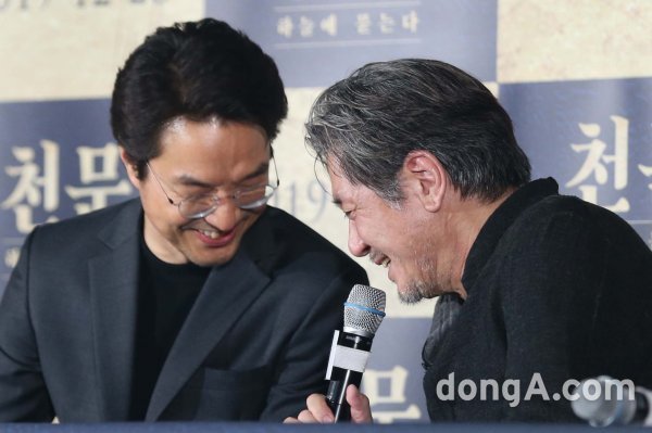 배우 한석규(왼쪽)와 촤민식이 16일 오후 서울광진구 CGV 건대입구에서 열린 영화 \'천문\' 언론배급시사회에 참석해 인사말을 하고 있다. .