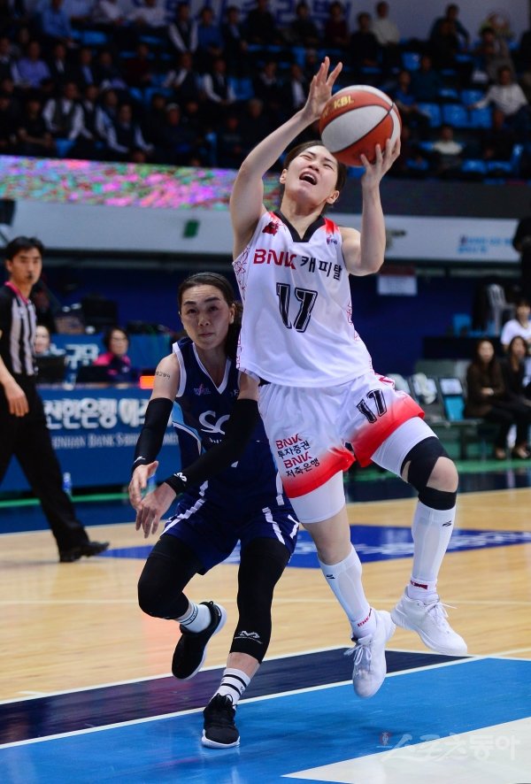 16일 인천 도원체육관에서 열린 ‘하나원큐 2019-2020 여자프로농구’ 인천 신한은행과 부산 BNK의 경기에서 BNK 정유진이 레이업슛 중 몸싸움에 밀리고 있다.