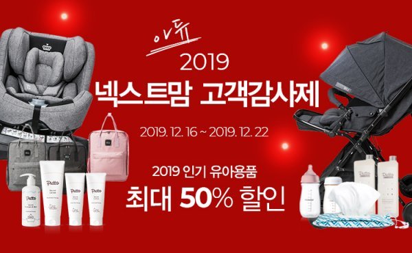 2019년 받은 고객 성원과 사랑에 보답하고자 마련했다. 카시트, 유모차 등 인기 육아용품부터 대표 유아 패션 브랜드인 아가방, 디어베이비, 에뜨와까지 최대 50% 할인 혜택을 제공한다.