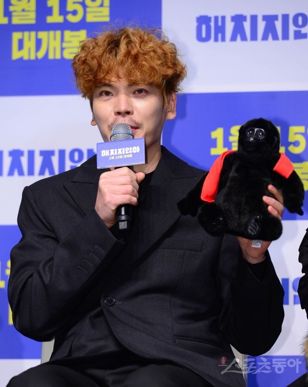 배우 김성오가 18일 서울 강남구 CGV 압구정점에서 열린 영화 ‘해치지않아’ 제작보고회에서 고릴라 인형을 들고 인사말을 하고 있다.