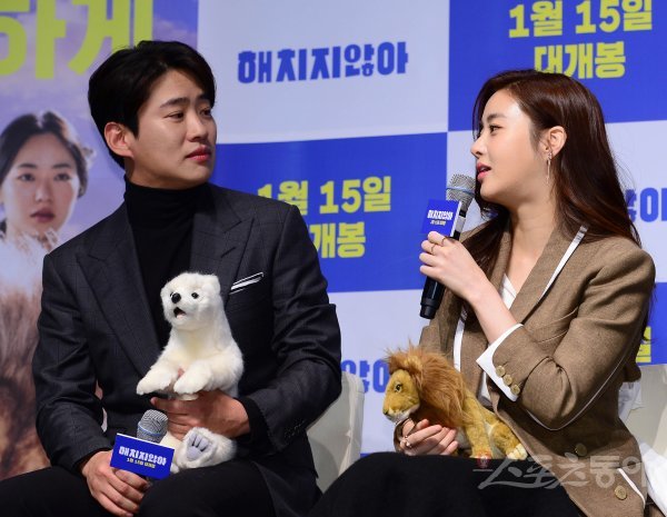 배우 안재홍(왼쪽)과 강소라가 18일 서울 강남구 CGV 압구정점에서 열린 영화 ‘해치지않아’ 제작보고회에서 마주보며 진행자의 질문에 답하고 있다.