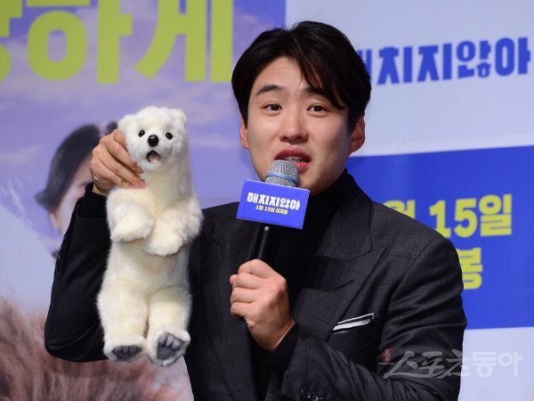 배우 안재홍이 18일 서울 강남구 CGV 압구정점에서 열린 영화 ‘해치지않아’ 제작보고회에서 북극곰 인형을 들고 진행자의 질문에 답하고 있다.
