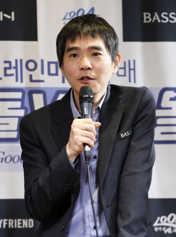 이세돌 9단이 18일 오후 서울 강남구 양재천로 바디프랜드 도곡타워에서 열린 2019 바디프랜드 브레인마사지배 ‘이세돌 vs 한돌’ 은퇴 대국 제1국에서 92수만에 불계승을 거둔 뒤 인터뷰를 하고 있다. 한돌은 국산 인공지능(AI) 프로그램이다.