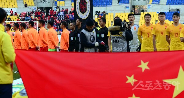 18일 부산 연제구 아시아드주경기장에서 열린 ‘2019 EAFF(동아시아축구연맹) E-1 챔피언십(동아시안컵)’ 중국과 홍콩의 남자부 축구 경기에서 홍콩 팬들이 중국 국가가 울려퍼지자 등을 돌리고 있다.