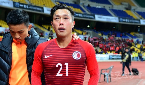 18일 부산 연제구 아시아드주경기장에서 열린 ‘2019 EAFF(동아시아축구연맹) E-1 챔피언십(동아시안컵)’ 중국과 홍콩의 남자부 축구 경기에서 중국에 0-2로 패한 홍콩 선수가 눈시울을 붉히고 있다.