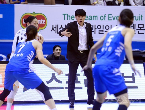 18일 아산이순신체육관에서 열린‘하나원큐 2019-2020 여자프로농구‘ KEB하나은행과 우리은행 경기에서 우리은행 위성우 감독이 작전 지시를 하고 있다.