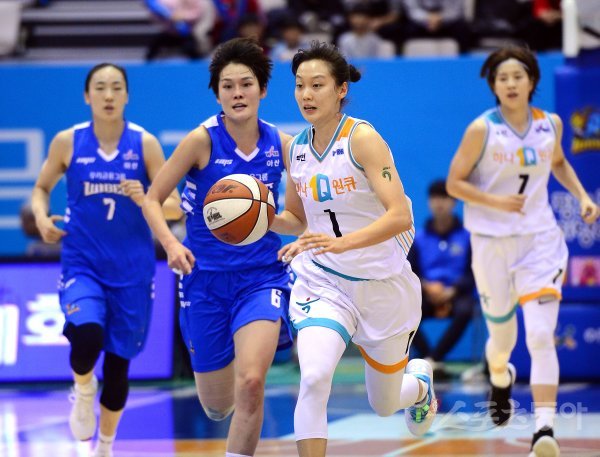 18일 아산이순신체육관에서 열린‘하나원큐 2019-2020 여자프로농구‘ KEB하나은행과 우리은행 경기에서 KEB하나은행 신지현이 우리은행의 수비를 뚫고 골밑을 공격하고 있다.