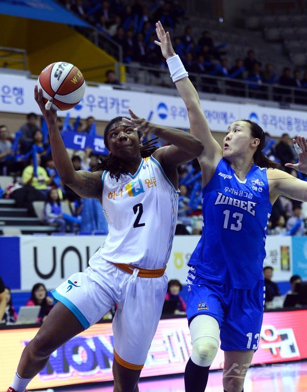 18일 아산이순신체육관에서 열린‘하나원큐 2019-2020 여자프로농구‘ KEB하나은행과 우리은행 경기에서 KEB하나은행 마이샤가 우리은행 김정은의 수비를 뚫고 골밑 슛을 하고 있다.