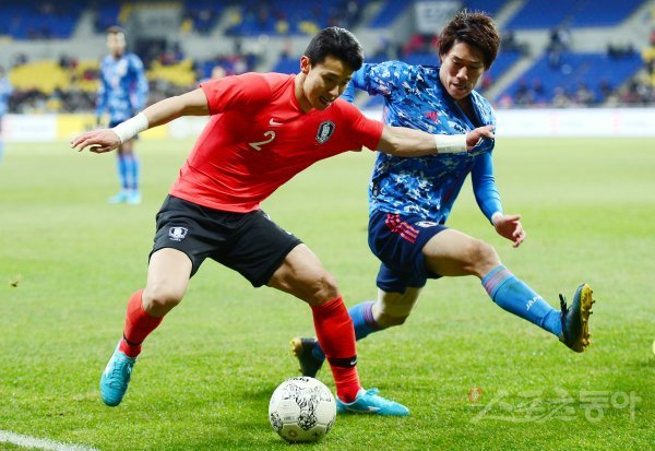 18일 부산 연제구 아시아드주경기장에서 열린 ‘2019 EAFF(동아시아축구연맹) E-1 챔피언십(동아시안컵)’ 한국과 일본의 남자부 축구 경기에서 한국 김태환이 일본 수비수를 제치며 돌파를 시도하고 있다.
