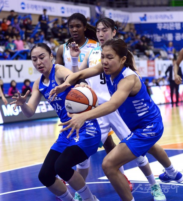 18일 아산이순신체육관에서 열린‘하나원큐 2019-2020 여자프로농구‘ KEB하나은행과 우리은행 경기에서 우리은행 김소니아와 박지현이 리바운드를 하다 충돌하고 있다.