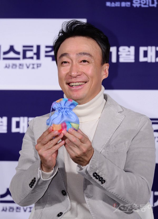 배우 이성민이 19일 서울 중구 메가박스 동대문점에서 열린 영화 ‘미스터 주: 사라진VIP’ 제작보고회에서 제작진으로부터 복주머니를 선물받고 해맑게 웃고 있다.