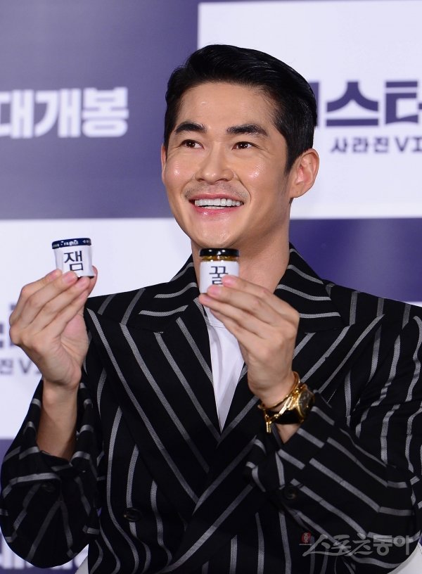 배우 배정남이 19일 서울 중구 메가박스 동대문점에서 열린 영화 ‘미스터 주: 사라진VIP’ 제작보고회에서 제작진으로부터 복주머니를 선물 받은 꿀과 잼을 들고 웃고 있다.