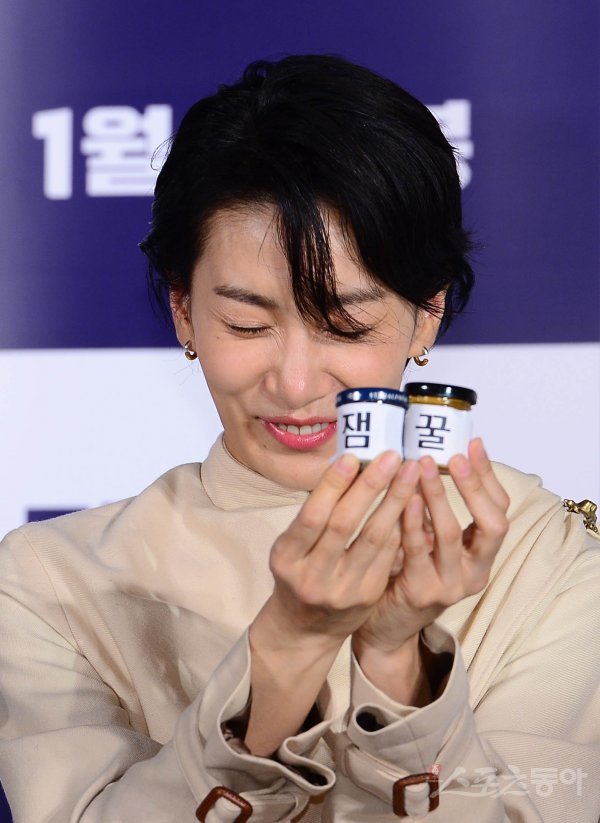 배우 김서형이 19일 서울 중구 메가박스 동대문점에서 열린 영화 ‘미스터 주: 사라진VIP’ 제작보고회에서 제작진으로부터 선물받은 꿀과 잼을 들고 웃고 있다.
