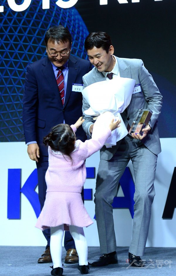 19일 서울 중구 웨스틴조선호텔에서 열린 ‘2019 KFA 어워즈’에서 공로패를 수상한 전 국가대표 이정수가 딸에게 축하 꽃다발을 받고 있다.
