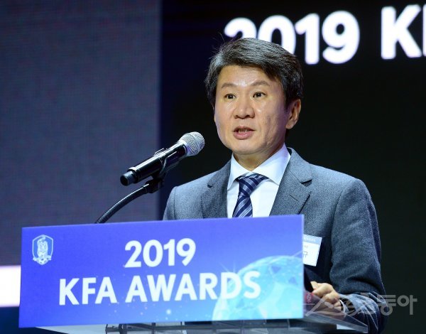 19일 서울 중구 웨스틴조선호텔에서 열린 ‘2019 KFA 어워즈’에서 대한축구협회 정몽규 회장이 환영사를 하고 있다.