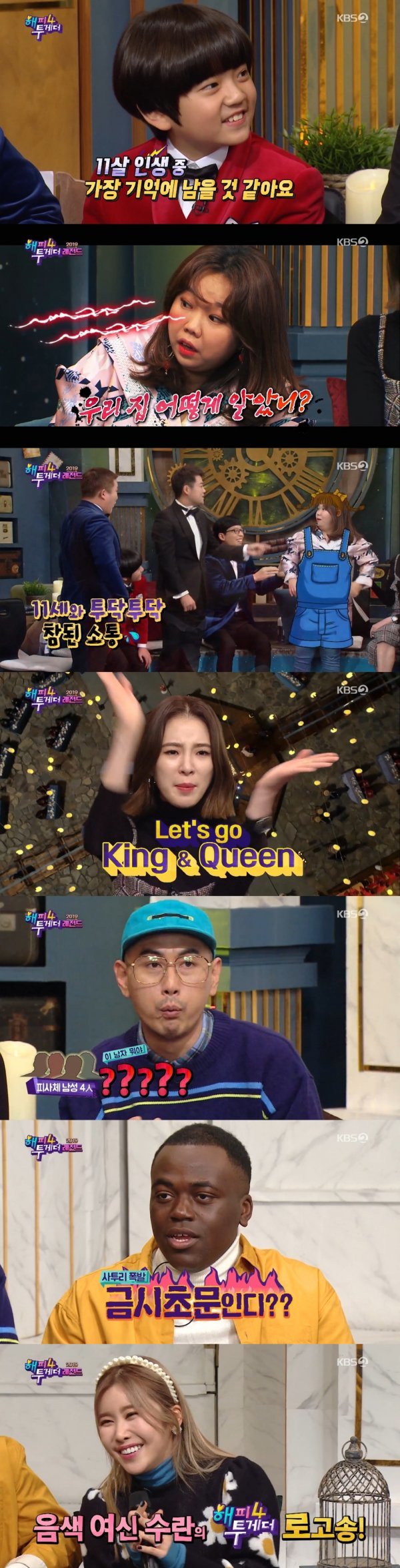 19일 방송된 KBS 2TV \'해피투게더4\'(이하 \'해투4\')는 2019년 \'해투4\'를 빛낸 게스트들이 총출동한 \'2019 해투 레전드\' 특집으로 꾸며졌다. 이날 방송에는 귀여움 레전드 김강훈이 스페셜 MC로 참여한 가운데 팜므파탈 레전드 홍현희, 글로벌 레전드 아이린, R&B 레전드 문명진, 왕국 레전드 조다난 토나, 예비 레전드 수란이 출연해 레전드 입담을 나눴다.