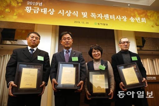 2019 스포츠동아 대상 시상식이 20일 서울 중구 한국프레스센터에서 열렸다. 이날 시상식에는 동아일보 김재호 사장, 동아일보 이희준 부사장, 스포츠동아 이인철 대표를 비롯해 동아일보·스포츠동아 독자센터 사장 등 200여 명이 참석했다. 스포츠동아 대상은 지역별로 공헌도가 높은 스포츠동아 독자센터 사장에게 수여하는 상이다. 이날 시상식에서는 우수 독자센터 사장 4명이 상을 받았다. 왼쪽부터 이재형(대전 남둔산) 이종실(서울 원남) 김병삼(부산 만덕·부인 최현숙 씨 대리 수상) 김제현(인천 계양계산) 독자센터 사장.