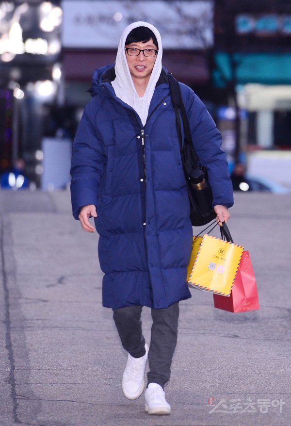 개그맨 유재석이 21일 서울 영등포구 KBS 별관에서 열린 KBS 2TV ‘해피투게더4’ 녹화에 참석해 팬들에게 받은 선물을 들고 있다.