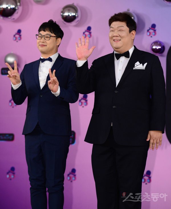 개그맨 권재관(왼쪽)과 유민상이 21일 서울 영등포구 KBS 본관 로비에서 열린 ‘2019 KBS 연예대상’ 포토월에서 포즈를 취하고 있다. 주현희 기자 teth1147@donga.com